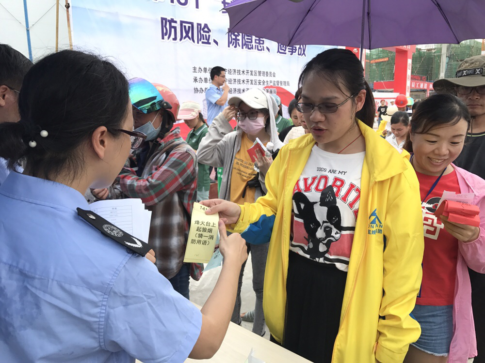 南寧經(jīng)濟開發(fā)區(qū)“安全生產(chǎn)活動月”正式啟動 2019年6月14日下午15時15分,南寧市經(jīng)濟開發(fā)區(qū)“安全生產(chǎn)活動月”啟動儀式在南寧市經(jīng)濟開發(fā)區(qū)金凱路玖譽城舉辦。 此次活動由南寧經(jīng)濟開發(fā)區(qū)管理委員會主辦,南寧市經(jīng)濟開發(fā)區(qū)安全生產(chǎn)監(jiān)督管理局承辦,南寧經(jīng)濟開發(fā)區(qū)建設發(fā)展局、龍光工程建設有限公司協(xié)辦。 廣西縱覽線纜集團有限公司組織員工參加本次啟動儀式,啟動儀式結束后現(xiàn)場進行了安全知識燈謎活動,縱覽集團各部門員工積極踴躍參與并贏得獎品。 領取安全燈謎 回答燈謎問題