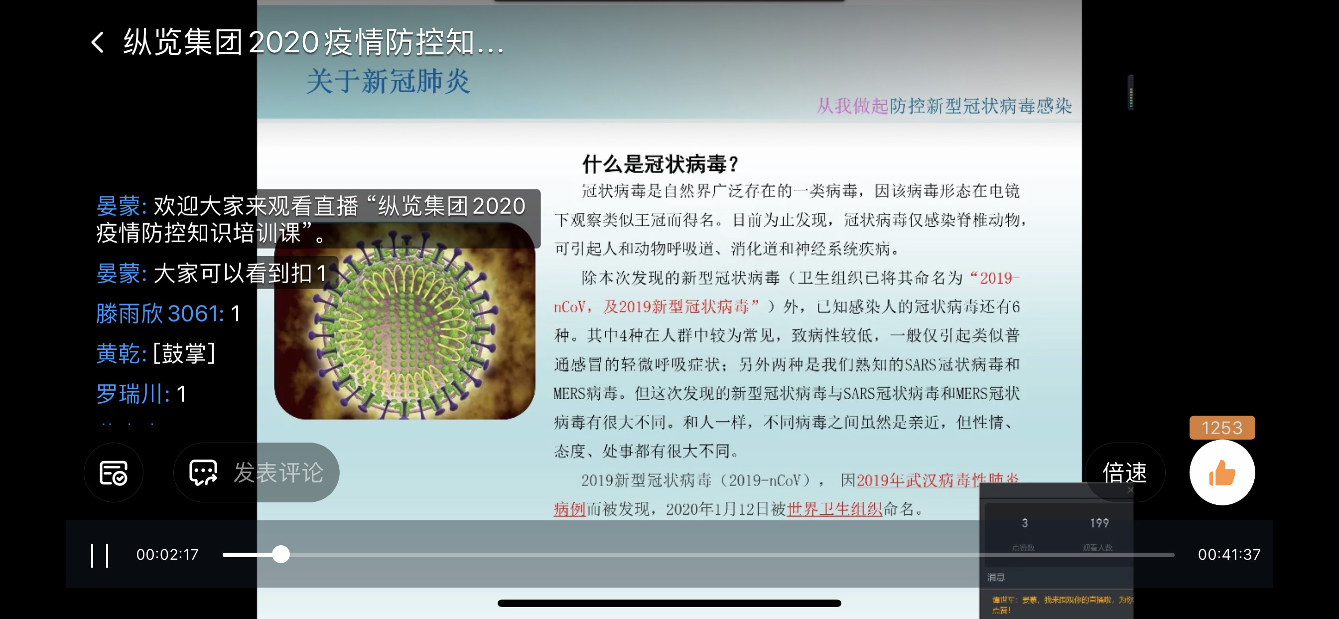 2月17日20點(diǎn)20分,廣西縱覽線纜集團(tuán)人力行政中心工作人員晏蒙以釘釘直播的形式,向全體員工進(jìn)行了一次新冠肺炎防控知識(shí)培訓(xùn),幫助大家正確認(rèn)識(shí)新型冠狀病毒,掌握科學(xué)防護(hù)方法。 “為了讓大家科學(xué)正確地了解防控知識(shí),今天我們以一種不一樣的模式開啟這堂培訓(xùn)課……”在此次視頻直播里,主播的語(yǔ)言生動(dòng)有趣又嚴(yán)謹(jǐn)科學(xué),同事們聽得津津有味。 本次直播分三個(gè)部分:一是關(guān)于新冠肺炎的相關(guān)知識(shí),二是疫情最新動(dòng)態(tài),三是疫情預(yù)防措施。 “效果非常好,語(yǔ)言清晰很流利!”低壓電纜事業(yè)部田利國(guó)觀看直播后說道。 直播結(jié)束后,300多位員工在線完成并通過了本次新型冠狀病毒防治閉卷考試。 |
