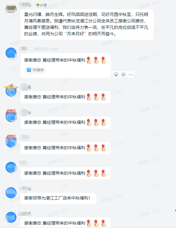 在中秋佳節(jié)來臨之際,為了讓員工感受到節(jié)日溫馨、團(tuán)圓的氣氛,增添節(jié)日喜慶,公司為全體員工發(fā)放了象征著平安與團(tuán)圓的中秋禮,表達(dá)了公司對(duì)員工們的節(jié)日祝福和一片溫情。 月餅雖小,但卻包含著公司對(duì)每一位員工濃濃的關(guān)愛。員工們手拿月餅,笑在臉上,樂在心里。 9月15日,集團(tuán)總裁唐崇健與安全生產(chǎn)部經(jīng)理黃金前往湛江分公司為員工送去祝福。收到祝福,員工在企業(yè)群里感謝公司領(lǐng)導(dǎo)“千里送福利”的行動(dòng),并表示在日后定將力爭(zhēng)一流,在平凡的崗位上創(chuàng)造不平凡的業(yè)績(jī),共同為縱覽集團(tuán)“月來月好”的明天而奮斗。 此外,公司還特設(shè)“縱覽郵局”,為有需要的縱覽家人定制“團(tuán)圓”,統(tǒng)一安排免費(fèi)代寄月餅服務(wù),送愛到家,送上一份中秋祝福。 送月餅傳溫情活動(dòng)傳遞了公司對(duì)縱覽家人們的衷心感謝和美好祝福。一份月餅,一份關(guān)懷。讓每位員工在崗位上踏實(shí)安心工作的同時(shí),更能感受到公司的人文關(guān)懷以及家一般的歸屬感。祝大家中秋節(jié)快樂! |