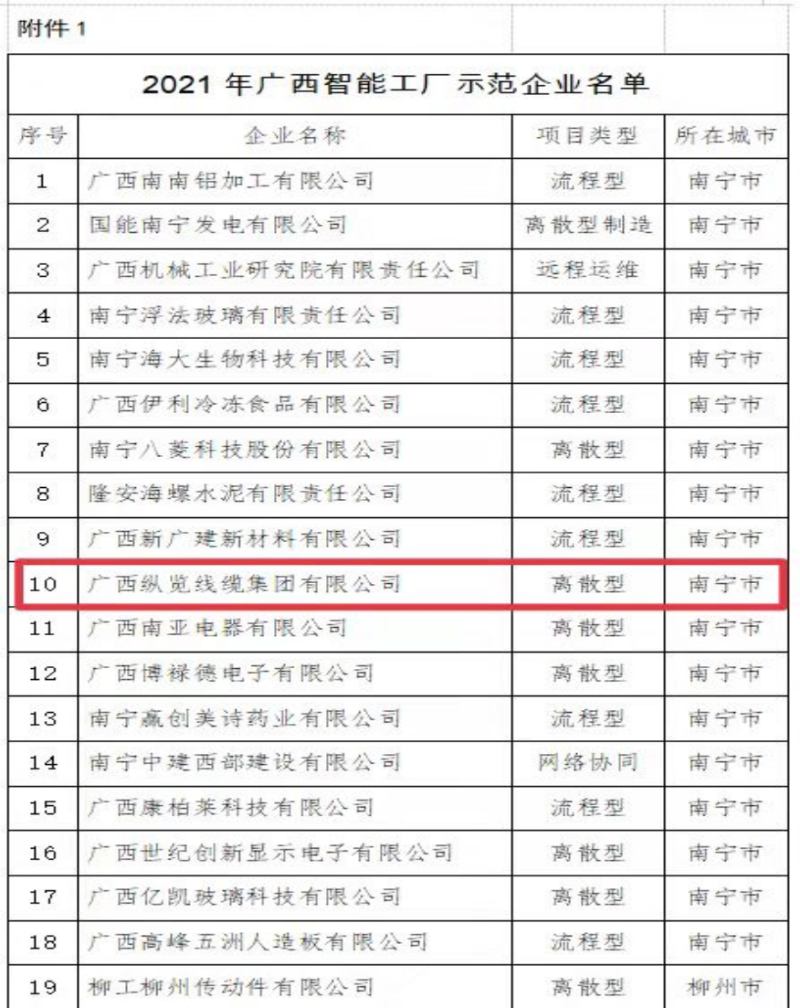 12月3日,自治區(qū)工業(yè)和信息化廳發(fā)布了關(guān)于公布2021年廣西智能工廠示范企業(yè)和數(shù)字化車間名單的通知,我集團(tuán)成功入選2021年廣西智能工廠示范企業(yè)名單,獲得“廣西智能工廠示范企業(yè)”榮譽(yù)稱號。標(biāo)志著縱覽線纜集團(tuán)生產(chǎn)制造、產(chǎn)品質(zhì)量把控能力和水平邁上一個新的臺階,市場競爭力進(jìn)一步增強(qiáng)。