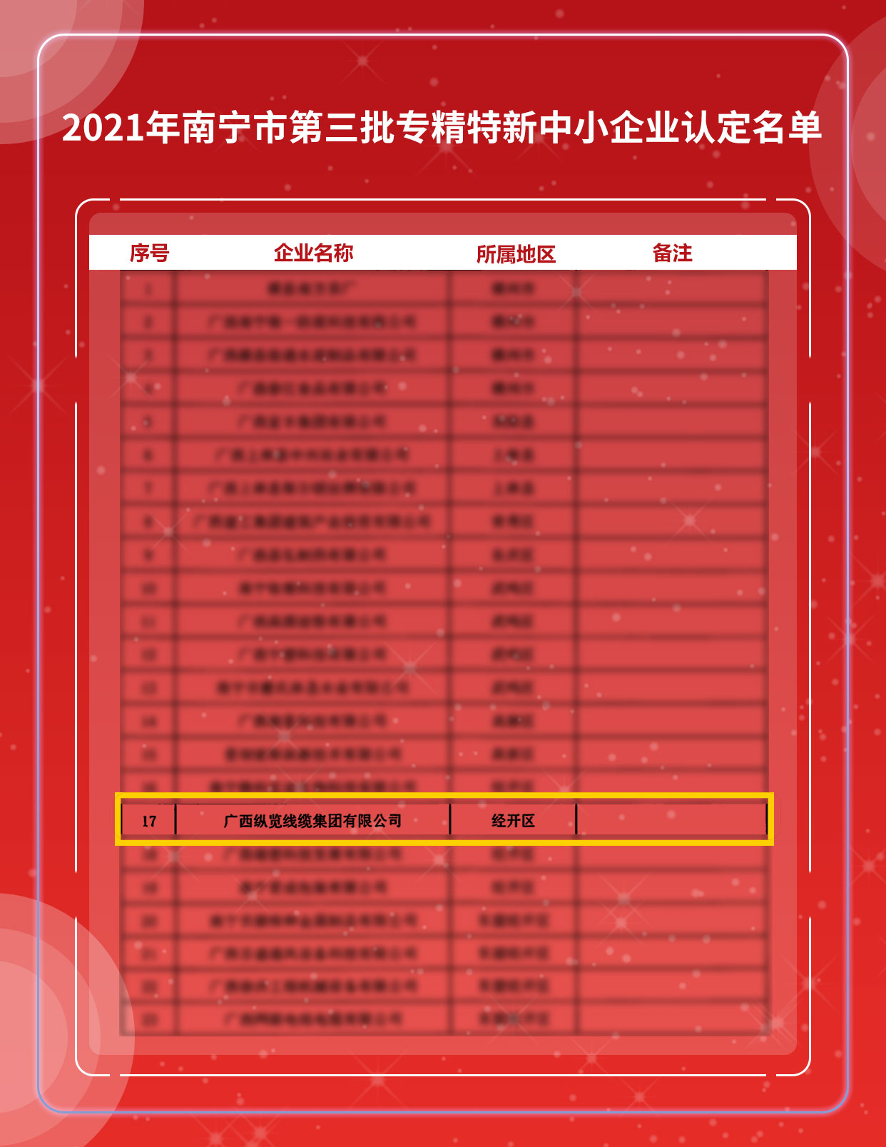 近日,南寧市發(fā)布《關(guān)于認(rèn)定2021年度南寧市第三批“專精特新”中小企業(yè)的通知》,我集團(tuán)公司順利通過認(rèn)定,成為“南寧市專精特新”企業(yè)。近年來(lái),我集團(tuán)在科技創(chuàng)新能力、智能化生產(chǎn)、全過程質(zhì)量管控、動(dòng)力線纜市場(chǎng)占有率、質(zhì)量效益方面走在行業(yè)前列,市場(chǎng)競(jìng)爭(zhēng)優(yōu)勢(shì)突出。當(dāng)前已成為南方電網(wǎng)在廣西電線電纜行業(yè)中唯一的線纜供應(yīng)商,也是南方電網(wǎng)最大的線纜供應(yīng)商。入選“專精特新”企業(yè),有利于進(jìn)一步促進(jìn)我集團(tuán)高質(zhì)量發(fā)展,更好地服務(wù)和融入“強(qiáng)首府戰(zhàn)略”,推動(dòng)生產(chǎn)力制造水平再上新臺(tái)階。 |