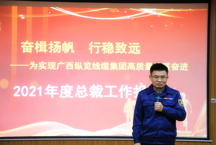2022年1月16日,縱覽線纜集團(tuán)2021年度中高層管理人員年終述職報(bào)告會(huì)在集團(tuán)多功能廳舉行,出席本次會(huì)議的領(lǐng)導(dǎo)有:集團(tuán)董事長(zhǎng)陳秀銳、集團(tuán)監(jiān)事會(huì)主席林曉敏、集團(tuán)副董事長(zhǎng)徐洪虎、總工程師劉小祥、董事長(zhǎng)助理兼審計(jì)監(jiān)察部經(jīng)理張彩菊、董事長(zhǎng)助理兼財(cái)務(wù)總監(jiān)陳楊、人力行政中心總監(jiān)吳培軍、市場(chǎng)總監(jiān)韋艷秋、大客戶部總監(jiān)李翠仙、工廠中心副總監(jiān)兼生產(chǎn)部經(jīng)理黎永豪等集團(tuán)各職能中心、部門中層管理者及骨干管理者共計(jì)90多位精英參加會(huì)議。 會(huì)上,各中心、各部門負(fù)責(zé)人結(jié)合本中心、本部門工作職能職責(zé)就年度工作任務(wù)、業(yè)績(jī)指標(biāo)、重點(diǎn)亮點(diǎn)等工作開展和完成情況逐一地向大會(huì)作了報(bào)告,對(duì)工作中存在的不足和問題進(jìn)行了分析檢討,就新的一年重點(diǎn)工作規(guī)劃作了講解。 在各中心、各部門負(fù)責(zé)人述職結(jié)束后,陳秀銳董事長(zhǎng)作了“奮楫揚(yáng)帆,行穩(wěn)致遠(yuǎn)——為實(shí)現(xiàn)廣西縱覽線纜集團(tuán)高質(zhì)量發(fā)展奮進(jìn)”年度工作報(bào)告,總結(jié)分析了公司2021年工作開展情況,對(duì)2022年工作進(jìn)作了部署。他指出,2021年,是“十四五”開局之年,也是縱覽發(fā)展中不平凡的一年,今天我們?cè)谶@里共同分析總結(jié)2021年度公司經(jīng)營(yíng)管理工作,部署落實(shí)2022年各項(xiàng)任務(wù)目標(biāo),動(dòng)員公司上下認(rèn)清形勢(shì)、明確目標(biāo)、落實(shí)責(zé)任,以更加昂揚(yáng)的斗志,更加堅(jiān)定的信心,更加有力的措施,全力以赴做好2022年各項(xiàng)工作。一要認(rèn)清形勢(shì),總結(jié)成績(jī),正視不足,堅(jiān)定完成2022年度目標(biāo)的信心。2021年,受全球“經(jīng)濟(jì)寒潮”和“疫情長(zhǎng)尾化”的影響,國(guó)內(nèi)外經(jīng)濟(jì)形勢(shì)依然處于低迷狀態(tài),全球能源物資極度緊張,國(guó)內(nèi)多地電力供應(yīng)緊張,電線電纜制造行業(yè)受銅、鋁等主要原材料價(jià)格飛漲等因素影響,更是雪上加霜,電網(wǎng)已簽訂的合同交貨即面臨著虧本,公司業(yè)務(wù)經(jīng)營(yíng)受到嚴(yán)重影響,企業(yè)經(jīng)營(yíng)和生存面臨著嚴(yán)峻的挑戰(zhàn)。面對(duì)危局,縱覽人沒有退路,唯有秣馬厲兵、自強(qiáng)不息、在磨難中成長(zhǎng),在危機(jī)中奮起,在變局中擔(dān)當(dāng)。二要圍繞目標(biāo),全面部署2022年度公司任務(wù)目標(biāo)和重點(diǎn)工作。2022年是“十四五”規(guī)劃執(zhí)行的第二年,國(guó)家經(jīng)濟(jì)發(fā)展面臨著需求收縮、供給沖擊、預(yù)期轉(zhuǎn)弱三重壓力,疫情對(duì)經(jīng)濟(jì)影響逐漸長(zhǎng)尾化,供應(yīng)鏈的穩(wěn)定性面臨沖擊,產(chǎn)業(yè)供應(yīng)效率還沒有完全恢復(fù)。企業(yè)的經(jīng)營(yíng)發(fā)展仍面臨著極大壓力與挑戰(zhàn),電線電纜行業(yè)“強(qiáng)者恒強(qiáng)、弱者更弱”的勢(shì)頭有所顯現(xiàn),行業(yè)龍頭企業(yè)將脫穎而出,競(jìng)爭(zhēng)白熱化的現(xiàn)實(shí)不可回避。我們要善于在競(jìng)爭(zhēng)中尋找機(jī)會(huì)和希望、在挑戰(zhàn)中創(chuàng)造奇跡,是縱覽人的使命和責(zé)任。希望全體縱覽人在逆境中堅(jiān)定信心、認(rèn)真抓好2022年度公司任務(wù)目標(biāo)和重點(diǎn)工作的落實(shí),團(tuán)結(jié)一致,奮勇前行,做出好成績(jī)。三要面對(duì)新形勢(shì),圍繞新目標(biāo),全體縱覽人須上下同心、奮楫揚(yáng)帆、行穩(wěn)致遠(yuǎn),為縱覽的加快發(fā)展形成強(qiáng)大合力。“做好產(chǎn)品回報(bào)客戶、做好企業(yè)回報(bào)社會(huì)”、 “做最好的線纜”,是縱覽人的使命和愿景。新形勢(shì)下,要實(shí)現(xiàn)這個(gè)目標(biāo),全體縱覽人要奮楫揚(yáng)帆、自強(qiáng)自立、迎難而上。管理團(tuán)隊(duì)要加快提升和加強(qiáng)磨煉,提升責(zé)任擔(dān)當(dāng)意識(shí)和經(jīng)營(yíng)管理水平,推動(dòng)全員同心、為縱覽的實(shí)現(xiàn)更快更好的發(fā)展形成強(qiáng)大的合力。 陳秀銳董事長(zhǎng)向各級(jí)領(lǐng)導(dǎo)干部強(qiáng)調(diào),一是進(jìn)一步轉(zhuǎn)變工作作風(fēng),強(qiáng)化管理責(zé)任,管理工作務(wù)實(shí)不務(wù)虛;二是進(jìn)一步強(qiáng)化目標(biāo)意識(shí),在提高管理的執(zhí)行力上下功夫;三是加快做好培訓(xùn)和人才培養(yǎng)工作,鼓勵(lì)優(yōu)秀員工和管理者到一線部門去輪崗鍛煉,培養(yǎng)一批適合公司發(fā)展需要的復(fù)合型管理人才;四是堅(jiān)持文化傳承、倡導(dǎo)正知正念、知行合一,提升團(tuán)隊(duì)的凝聚力和戰(zhàn)斗力,形成公司發(fā)展的合力。 明者因時(shí)而變,知者隨事而制,強(qiáng)者乘勢(shì)而上。2022年,困難和機(jī)遇并存,壓力和信心同在。經(jīng)歷了十八年風(fēng)雨洗禮的縱覽人,將堅(jiān)持“做最好的線纜”、“做好產(chǎn)品回報(bào)客戶,做好企業(yè)回報(bào)社會(huì)”,以信念為“舵”,能力為“槳”,上下齊心、堅(jiān)定目標(biāo)、振奮精神,凝聚起強(qiáng)大的奮進(jìn)力量,釋放出高質(zhì)量