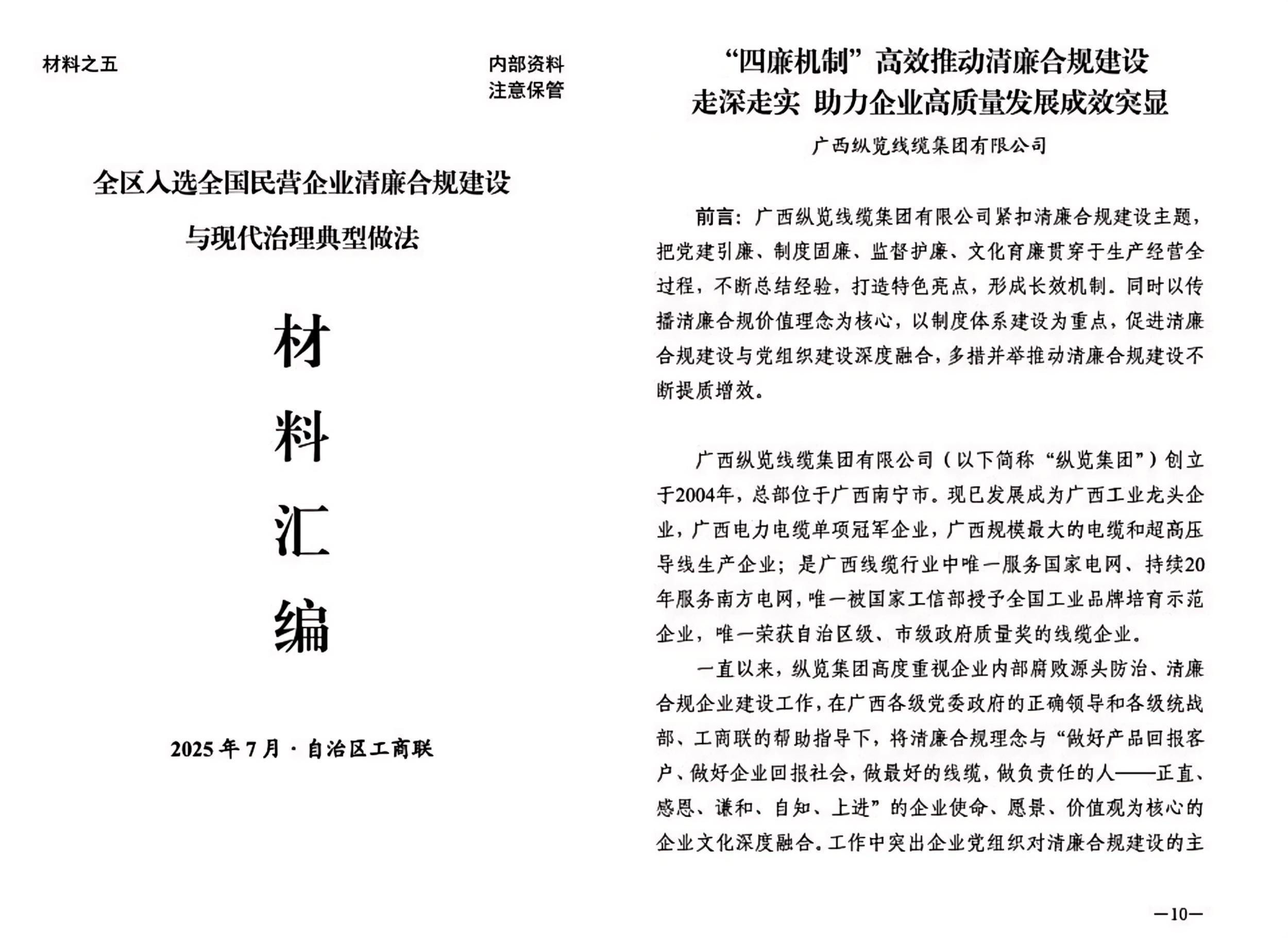 7月14-15日,2025年全區(qū)清廉民企建設(shè)提質(zhì)增效現(xiàn)場(chǎng)推進(jìn)活動(dòng)暨民營(yíng)企業(yè)建立完善中國(guó)特色現(xiàn)代企業(yè)制度試點(diǎn)工作啟動(dòng)會(huì)在來(lái)賓召開(kāi) 。來(lái)賓市委書(shū)記何朝建致辭;自治區(qū)黨委統(tǒng)戰(zhàn)部副部長(zhǎng)、工商聯(lián)黨組書(shū)記、清廉民企建設(shè)專責(zé)小組組長(zhǎng)丘德彬,自治區(qū)黨委巡視組副組長(zhǎng)、巡視專員、清廉廣西領(lǐng)導(dǎo)小組辦公室綜合組副組長(zhǎng)張勤儉分別講話。期間,與會(huì)代表實(shí)地觀摩學(xué)習(xí)了來(lái)賓有關(guān)企業(yè)、商會(huì)清廉建設(shè)的做法經(jīng)驗(yàn),聆聽(tīng)了浙大教授作的民營(yíng)企業(yè)治理現(xiàn)代化專題輔導(dǎo);會(huì)議還發(fā)放了《全區(qū)入選全國(guó)民營(yíng)企業(yè)清廉合規(guī)建設(shè)與現(xiàn)代化治理典型做法》等交流學(xué)習(xí)材料,我縱覽線纜集團(tuán)的《“四廉機(jī)制”高效推動(dòng)清廉合規(guī)建設(shè)走深走實(shí) 助力企業(yè)高質(zhì)量發(fā)展成效突顯》做法代表廣西線纜行業(yè)與其他19家民營(yíng)企業(yè)光榮入選。 一直以來(lái),我集團(tuán)高度重視企業(yè)內(nèi)部腐敗源頭防治、清廉合規(guī)企業(yè)建設(shè)工作,在廣西各級(jí)黨委政府的正確領(lǐng)導(dǎo)和各級(jí)統(tǒng)戰(zhàn)部、工商聯(lián)的幫助指導(dǎo)下,將清廉合規(guī)理念與“做好產(chǎn)品回報(bào)客戶、做好企業(yè)回報(bào)社會(huì),做最好的線纜,做負(fù)責(zé)任的人——正直、感恩、謙和、自知、上進(jìn)”的企業(yè)使命、愿景、價(jià)值觀為核心的企業(yè)文化深度融合。工作中突出企業(yè)黨組織對(duì)清廉合規(guī)建設(shè)的主導(dǎo)地位,充分發(fā)揮黨支部的政治功能和組織功能,多措并舉擦亮民企清廉底色,實(shí)現(xiàn)了清廉合規(guī)建設(shè)與企業(yè)經(jīng)營(yíng)工作有機(jī)契合、一體推動(dòng)、兩不誤雙促進(jìn);形成了“優(yōu)在制度、重在執(zhí)行、嚴(yán)在監(jiān)督、成在整改”這一縱覽集團(tuán)獨(dú)特、長(zhǎng)效的企業(yè)內(nèi)部腐敗源頭防治機(jī)制和企業(yè)經(jīng)營(yíng)管理體系,實(shí)現(xiàn)了清廉合規(guī)建設(shè)與企業(yè)生產(chǎn)經(jīng)營(yíng)有機(jī)契合、一體推動(dòng)、兩不誤雙促進(jìn),在構(gòu)建親清統(tǒng)一的新型政商關(guān)系、營(yíng)造風(fēng)清氣正的市場(chǎng)環(huán)境中進(jìn)行了卓有成效的探索和實(shí)踐,有效推動(dòng)了企業(yè)內(nèi)部腐敗源頭防治、清廉合規(guī)建設(shè)在縱覽集團(tuán)走深走實(shí),取得積極成效。 我們真切體會(huì)到:清廉合規(guī)建設(shè)在縱覽集團(tuán)高質(zhì)量發(fā)展過(guò)程中發(fā)揮著重要作用,有效推動(dòng)了企業(yè)內(nèi)外關(guān)系的和諧發(fā)展和社會(huì)責(zé)任的履行,有效推動(dòng)了經(jīng)營(yíng)業(yè)務(wù)的拓展、社會(huì)形象的提升。一方面,集團(tuán)實(shí)現(xiàn)了連續(xù)6年進(jìn)入中國(guó)機(jī)械500強(qiáng)、中國(guó)線纜產(chǎn)業(yè)最具競(jìng)爭(zhēng)力企業(yè) 100 強(qiáng),廣西制造業(yè)企業(yè)、廣西民營(yíng)企業(yè)、廣西民營(yíng)企業(yè)制造業(yè) 100 強(qiáng);實(shí)現(xiàn)連續(xù) 5 年獲評(píng)廣西守合同重信用企業(yè),連續(xù)9年被國(guó)家稅務(wù)總局評(píng)為“納稅信用 A級(jí)企業(yè)”;先后榮獲“國(guó)家高新技術(shù)企業(yè)、國(guó)家級(jí)綠色工廠、國(guó)家知識(shí)產(chǎn)權(quán)優(yōu)勢(shì)企業(yè),廣西工業(yè)龍頭企業(yè)、廣西電力電纜單項(xiàng)冠軍企業(yè)、廣西壯族自治區(qū)主席質(zhì)量獎(jiǎng)提名獎(jiǎng)、廣西智能工廠示范企業(yè)、廣西專精特新企業(yè)、廣西工業(yè)企業(yè)質(zhì)量管理標(biāo)桿、廣西技術(shù)創(chuàng)新示范企業(yè)、南寧市市長(zhǎng)質(zhì)量獎(jiǎng)、南寧市清廉民營(yíng)企業(yè)建設(shè)標(biāo)桿企業(yè)、南寧市清廉民營(yíng)企業(yè)建設(shè)先進(jìn)單位等榮譽(yù)稱號(hào)。另一方面,集團(tuán)重點(diǎn)優(yōu)質(zhì)客戶實(shí)現(xiàn)持續(xù)增加,在電網(wǎng)建設(shè)領(lǐng)域服務(wù)區(qū)域從南方電網(wǎng)的5省區(qū)已擴(kuò)展至全國(guó)16個(gè)省區(qū)市的同時(shí),還成為中交集團(tuán)、中建集團(tuán)、中能建集團(tuán)、廣西投資集團(tuán)、廣西北港集團(tuán)、廣西北投集團(tuán)、廣西交投集團(tuán)、廣西建工集團(tuán)、廣西現(xiàn)代物流集團(tuán)、柳鋼集團(tuán)和南寧軌道、南寧產(chǎn)投、南寧城投、建寧水務(wù)集團(tuán)等20多家央地國(guó)企的優(yōu)秀供應(yīng)商。集團(tuán)結(jié)合企業(yè)經(jīng)營(yíng)實(shí)際,在三年多的新冠疫情期間,主動(dòng)承擔(dān)各區(qū)疫情防控所需的“小湯山”醫(yī)院用電線纜的緊急供應(yīng)任務(wù);向12所學(xué)校開(kāi)展捐資助學(xué)活動(dòng);通過(guò)全額資助學(xué)費(fèi)方式,支持、鼓勵(lì)廣西學(xué)子就讀河南工學(xué)院電線電纜專業(yè),為廣西培養(yǎng)電線電纜專業(yè)人才;集團(tuán)每銷售1公里電線電纜產(chǎn)品向南寧市見(jiàn)義勇為基金會(huì)捐獻(xiàn)1元人民幣